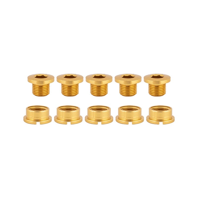For use with single chainring cranksets. Inside height measures 4mm when tightened 7mm total height. Set of 5 bolts and nuts. Available in multiple colors