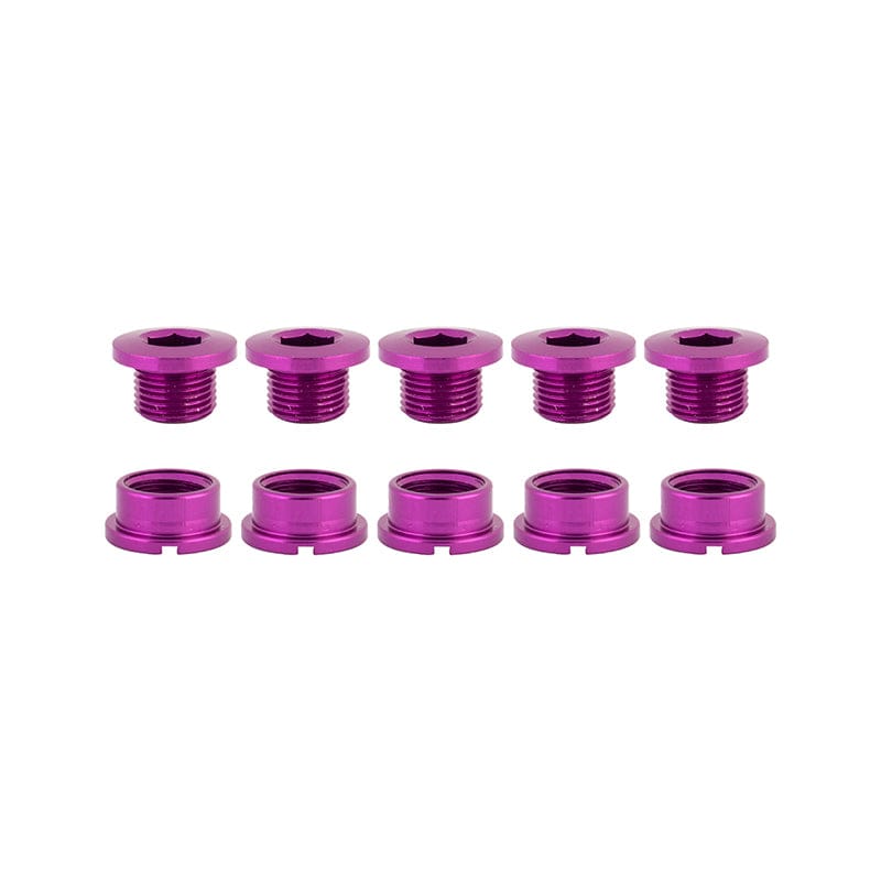 For use with single chainring cranksets. Inside height measures 4mm when tightened 7mm total height. Set of 5 bolts and nuts. Available in multiple colors