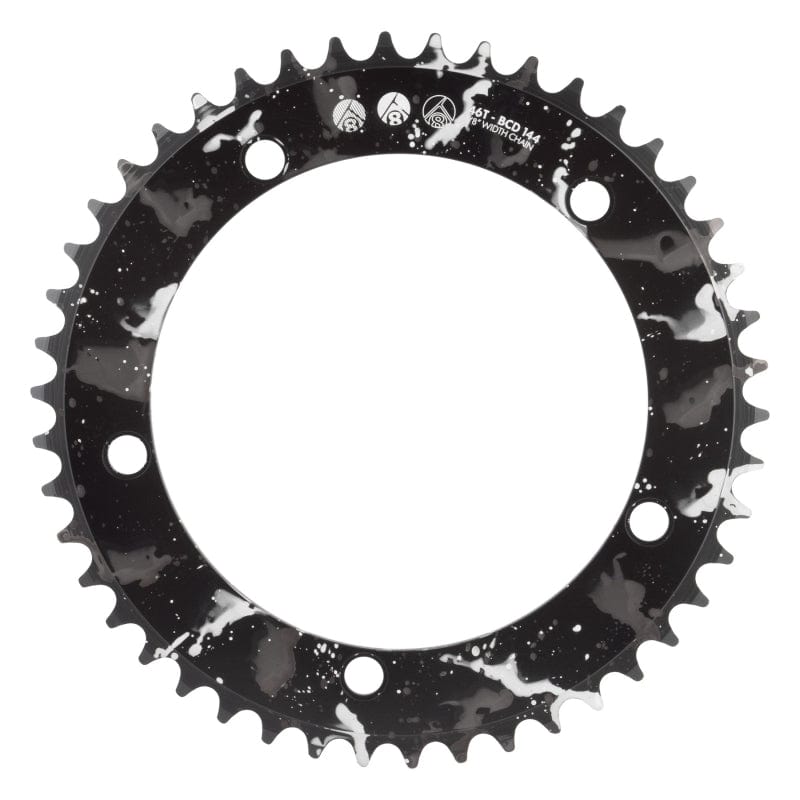 CNC machined AL6061-T6 alloy construction. Great for all single speed applications. Hand-applied splatter anodized finish makes each chainring unique. 5-Bolt 144mm BCD pattern. 1/2` x 1/8` tooth profile