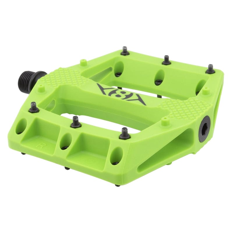 Foot retention strap compatible design for single speed/fixed gear as well as MTB or BMX riding. Pedal body made of ruggedly durable engineering grade thermoplastic. Sealed bearing and LSL sleeve bushing. 9/16` CNC chromoly spindle. 113mm x 114mm x 20mm concave platform. 8 fixed pins and 12 M3-9mm replaceable pins. 360g per pair