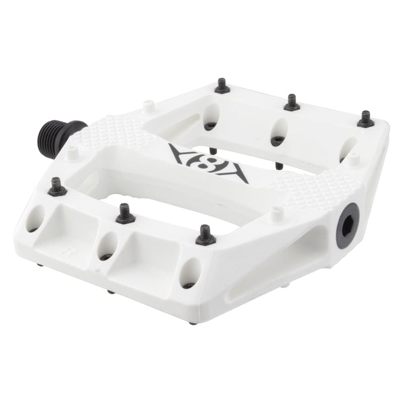Foot retention strap compatible design for single speed/fixed gear as well as MTB or BMX riding. Pedal body made of ruggedly durable engineering grade thermoplastic. Sealed bearing and LSL sleeve bushing. 9/16` CNC chromoly spindle. 113mm x 114mm x 20mm concave platform. 8 fixed pins and 12 M3-9mm replaceable pins. 360g per pair