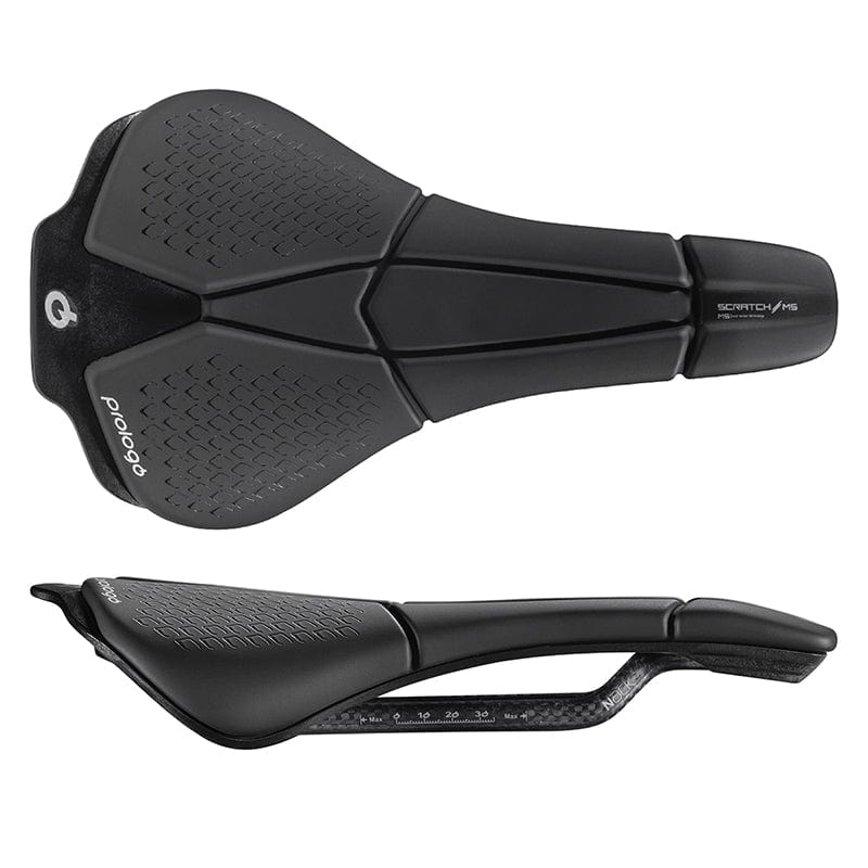 Scratch M5 is the new line of saddles that use 4.0 technologies; innovative in terms of size shape and ergonomics they are suitable for multiple uses from road and off-road to Triathlon. The Round Shape of the M5 allows the pelvis a natural rotation creating stability and support for the lumbar areas and distributes pressure over a greater area. MSS Multi Section System - This technology provides three different individual zones mapped and separated along the saddle each composed of different interactive foams and single-cell padding. Nack models feature a Nano Carbon composite rail paired with reinforced seat clamp area for the perfect fusion of performance and reliability. Tirox model features an aerospace light Ti-Alloy rail that provides a balance of weight and strength. New T-Shape base offers comfortable unisex design