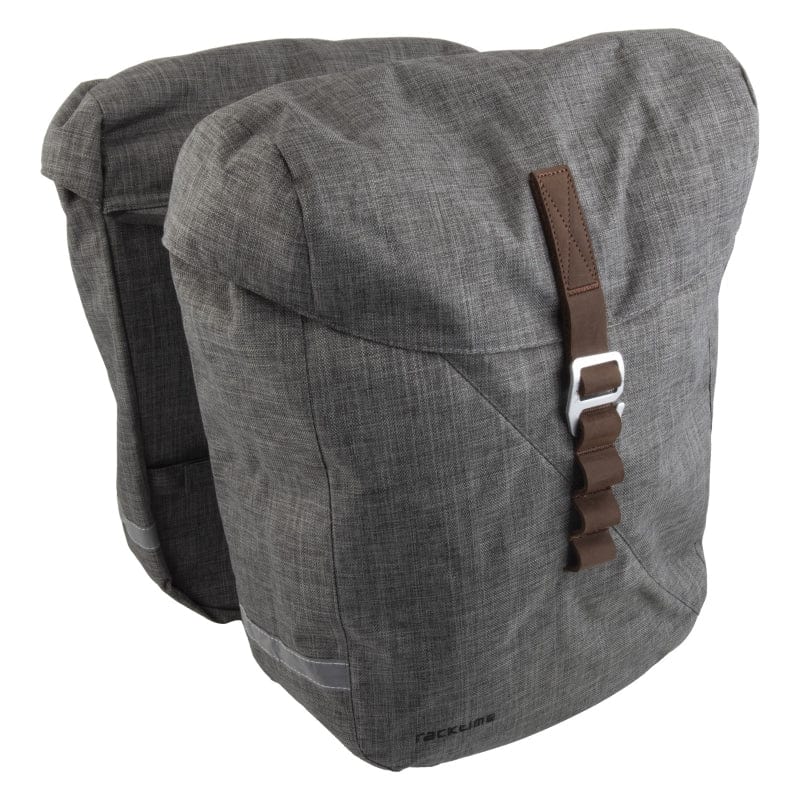 Sophisticated looking dual pannier bag with leather handle and straps aluminium hooks water repellent fabric and embroidered logo. Two smaller inner pockets and subtle yet effective reflective accents add usability to the dashing good looks. SnapIt 2.0 bracket installs quickly and easily onto and Racktime 2.0 carrier