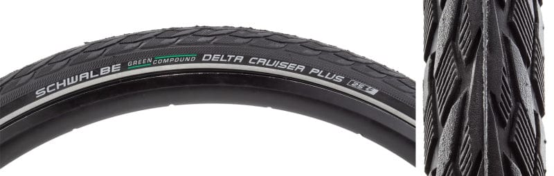 Classic center rib profile is versatile and offers pleasant rolling characteristics. Green Compound is manufactured from natural rubber obtained from renewable rubber trees and from recycled rubber materials. Equipped with a 50 TPI carcass and reflective trim. Also equipped with a 3mm Puncture Guard. PGRD - Puncture Guard Affordable 3mm rubber breaker belt . Twin Skin - An additional rubber coating on the side protects against cuts and allows for uniform coloring. EBIKE25 - has achieved a passing rating for use with E-Bikes up to 25kph. *Please note that EBike rated tires also can be used with non-Ebikes and are generally more durable than standard tires