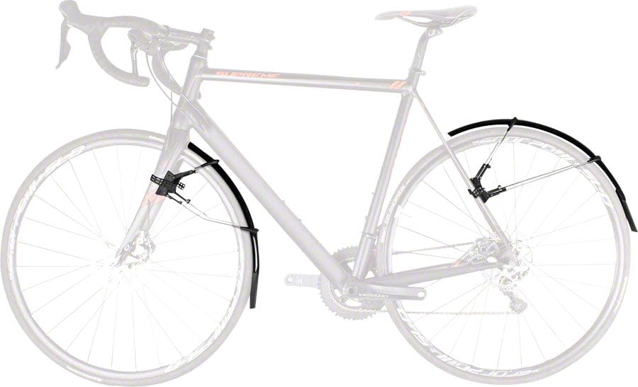 A lightweight and easily installed clip-on fender set for road bikes with tires up to 25mm.Double hinged quick release fitting system fits aero forks and is compatible with disc brakes Can be adapted to the radius of the wheel by adjusting the length of the stays Superlight extra-long mud flaps give additional spray protection Paintwork protection film for the frame and fork is included