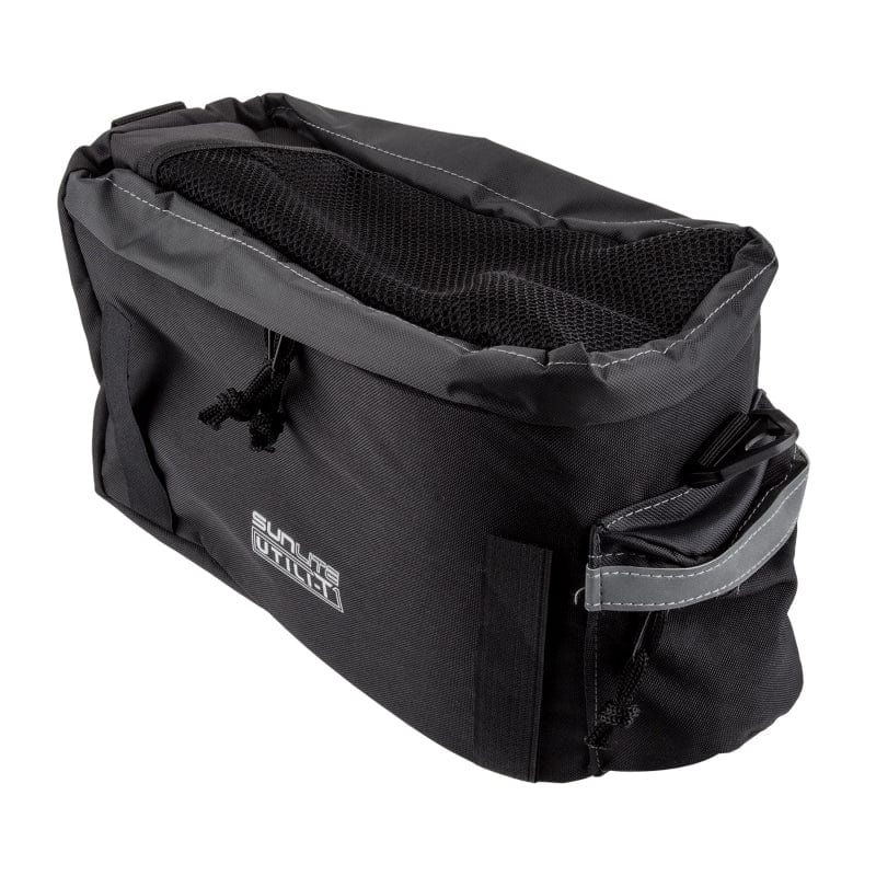 Constructed from water resistant 600D polyester. Large reflective trim. Heavy duty zippers. One main compartment and one rear accessory compartment. Includes removable shoulder strap. Mounts to rack with four Velcro straps