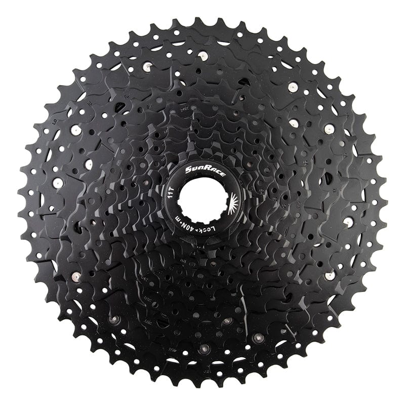 11-speed wide range cassette. Hi-Tensile steel construction with engineering grade polymer spacers. 6 sprockets on 2 alloy spiders. Steel lockring