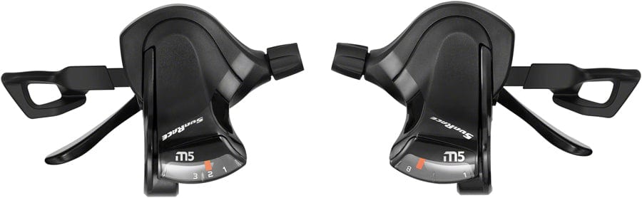 The SunRace M5 8-Speed Trigger Shifter Set features a gear display and push/pull lever design.For 3x8-speed drivetrains Push-Pull shifting operation Shimano compatible Podium top gear display for easy identification of gear position Alloy large lever for added strength and weight savings Slick-galvanized cable for smooth operation