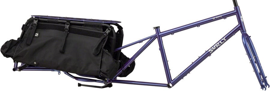 The Surly Big Dummy. Designed to transport a rider and up to 200 pounds of cargo the Big Dummy retains an extremely smooth and maneuverable ride under the heaviest of burdens. Big Dummy bikes ship with a Dummy deck rails Dummy Rail Collars bags and kickstand.100% Surly chromoly steel; fork is suspension corrected for 80mm Fender eyelets and Surly Trip Guides for continuous brake/shift housing or brake hydraulic lines Two standard bottle mounts and one 3-pack mount on Small frame; three standard bottle mounts and one 3-pack mount on Medium and Large; four 3-pack mounts on the fork Includes (2) Surly Dummy Rail Collars for a stiffer Dummy Rail/Frame interface Length of the frame requires 2 chains and tandem cables 26 x 2.5" maximum tire clearance; absolutely no limitation on chainring sizes Weight Limit: 400 lbs. combined rider & cargo Three wide-ranging frame sizes to fit most riders (SML)