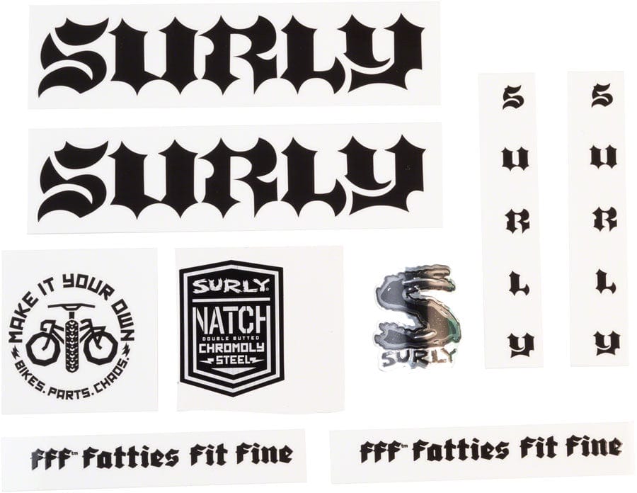Further personalize your unique Surly bike with one of four Surly Make It Your Own Decal Sets featuring alternative fonts and designs for the discerning rider. Stickers may also be affixed to helmets mini fridges dog food bowls and more.Decals are available in black or white Each set includes decals for the down tube chainstays and fork blades a Surly Make It Your Own seat tube icon Surly headbadge and a ’Natch frame sticker Dry-transfer style