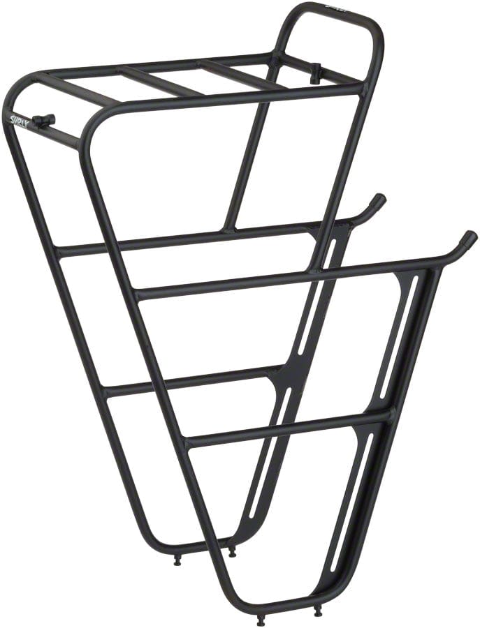 The Surly Front Rack is adjustable to fit from 26" to 29" wheels.Tubular CroMoly rack stainless steel and aluminum hardware Not compatible with 135mm or wider spaced forks Lower plates redesigned to add strength and increase clearance for disc calipers Pannier support area: 121 inches cubed per side Surface finish: phosphate coated inside and out powder coated exterior UniCrown plate no longer included only comes with Lower and Upper plates