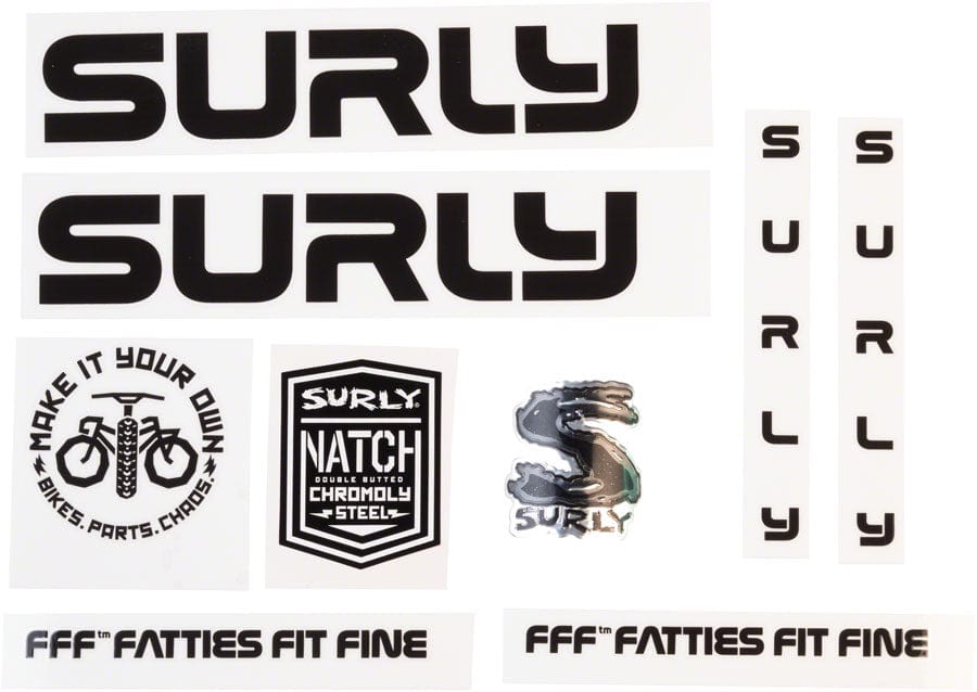 Further personalize your unique Surly bike with one of four Surly Make It Your Own Decal Sets featuring alternative fonts and designs for the discerning rider. Stickers may also be affixed to helmets mini fridges dog food bowls and more.Decals are available in black or white Each set includes decals for the down tube chainstays and fork blades a Surly Make It Your Own seat tube icon Surly headbadge and a ’Natch frame sticker Dry-transfer style