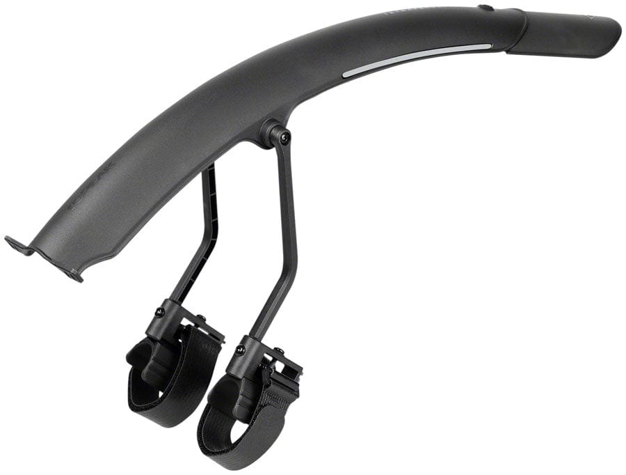 The perfect quick-mount fender that attaches to road bikes with hook and loop straps easily and securely. Adjustable struts provide a closer fit to the tire and excellent mud / spray protection while the highly polished underside helps prevent dirt buildup and aids in cleaning. Rear features a unique two-piece dual tone design provides short or longer fender usage options for a precise fit with your bike. Included 3M reflective decals provide safety at night.