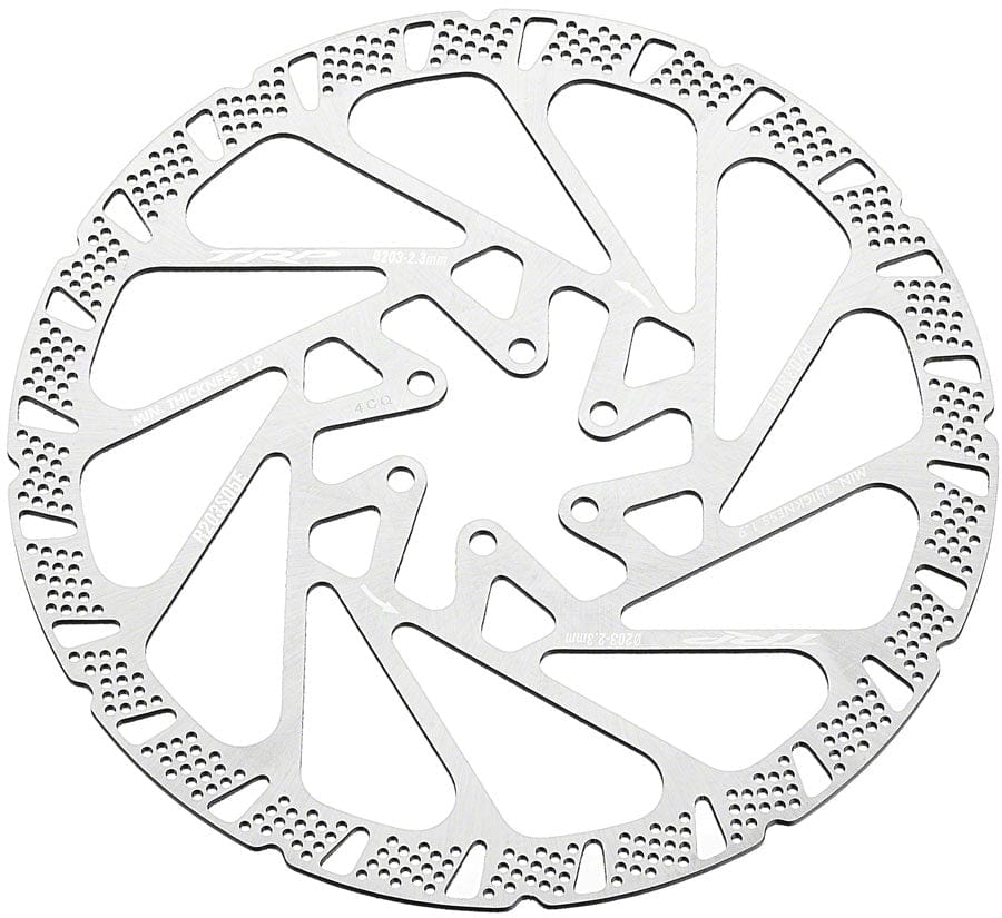 Born and bred on the World Cup Downhill circuit the TRP S05E 2.3mm thick disc brake rotor was created to meet the ever increasing demands of the worlds fastest riders. Boasting a 10% improved deceleration rate and increased surface area for improved heat dissipation you'll stop faster and have more control over your braking than ever before.New hole pattern and increased service area for improved heat management Improved temperature stability over sustained descents makes this a rotor that's optimized for DH performance 10% improved deceleration rate Laser cut and rust block treatment offers increased accuracy and resistant to degradation from the elements 2.3mm thickness / Minimum 1.9mm thickness (Please ensure your caliper is compatible with 2.3mm thick rotors) Includes (6) T25 torx head rotor bolts