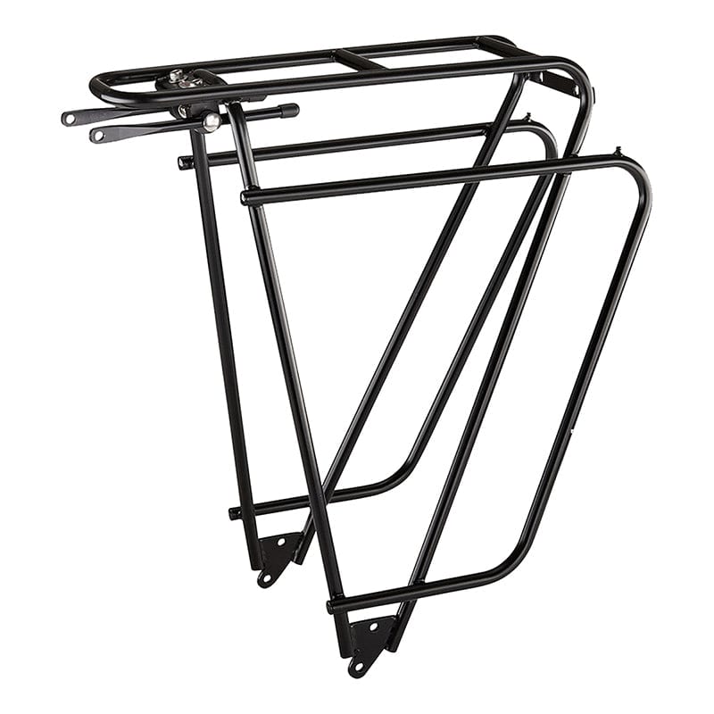 Narrow rear rack with lower pannier mounting bar - lowering the center of gravity and improving the riding stability while fully loaded. Features hooks on the pannier mounting bar that prevent bags from moving while riding. The LOGO also fits on particularly short bicycle frames perfectly. Available in 26`/700c models as well as 29` specific model. Compatible with tires up to 60mm wide. Cargo area tapers from 86 to 100mm
