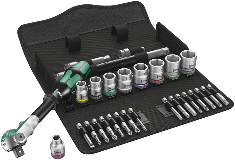 Incredibly compact set arrangement with many tools in a minimum of space. A completely new ratchet set feeling thanks to the unique textile boxes that are very robust and durable. They can be positioned upright for tidy storage on the workshop shelf. Additional surface protection due to textile outer material. Low weight and volume for simpler mobility.Freely pivoting ratchet head with 5 predefined locking positions Fine toothing with 72 teeth Small return angle of only 5 degrees Free-turning sleeve for high working speeds Take it easy tool finder: color coding by size