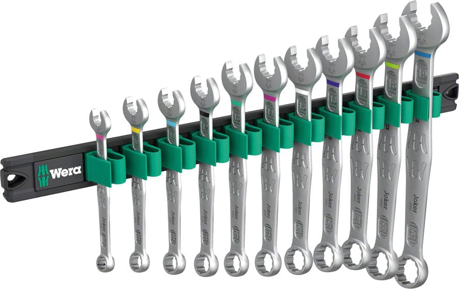 The 11-piece metric ring spanner set comes on a magnetic rail. Featuring a 7.5° offset open end and double hexagon geometry the Joker 6003 offers four placement points with a 180° turn engaging bolts every 15° for easier use in tight spaces. The slim robust ring side is tilted 15° to the tool axis. Its high-quality surface treatment ensures long-lasting corrosion protection. The "Take it easy" tool finder uses color coding by size and the clips hold the tools securely. The rail attaches firmly to metal surfaces with a strong magnet or can be bolted to the wall.Strong magnet allows secure attachment to metal surfaces or can be bolted to the wall Clips hold tools perfectly making it especially suitable for tight spaces Special open-end geometry expands placement possibilities Low return angle in the open end engages the screw every 15°; slim ring side with 15° crank Includes Take it easy tool finder with color coding by size 11-piece set